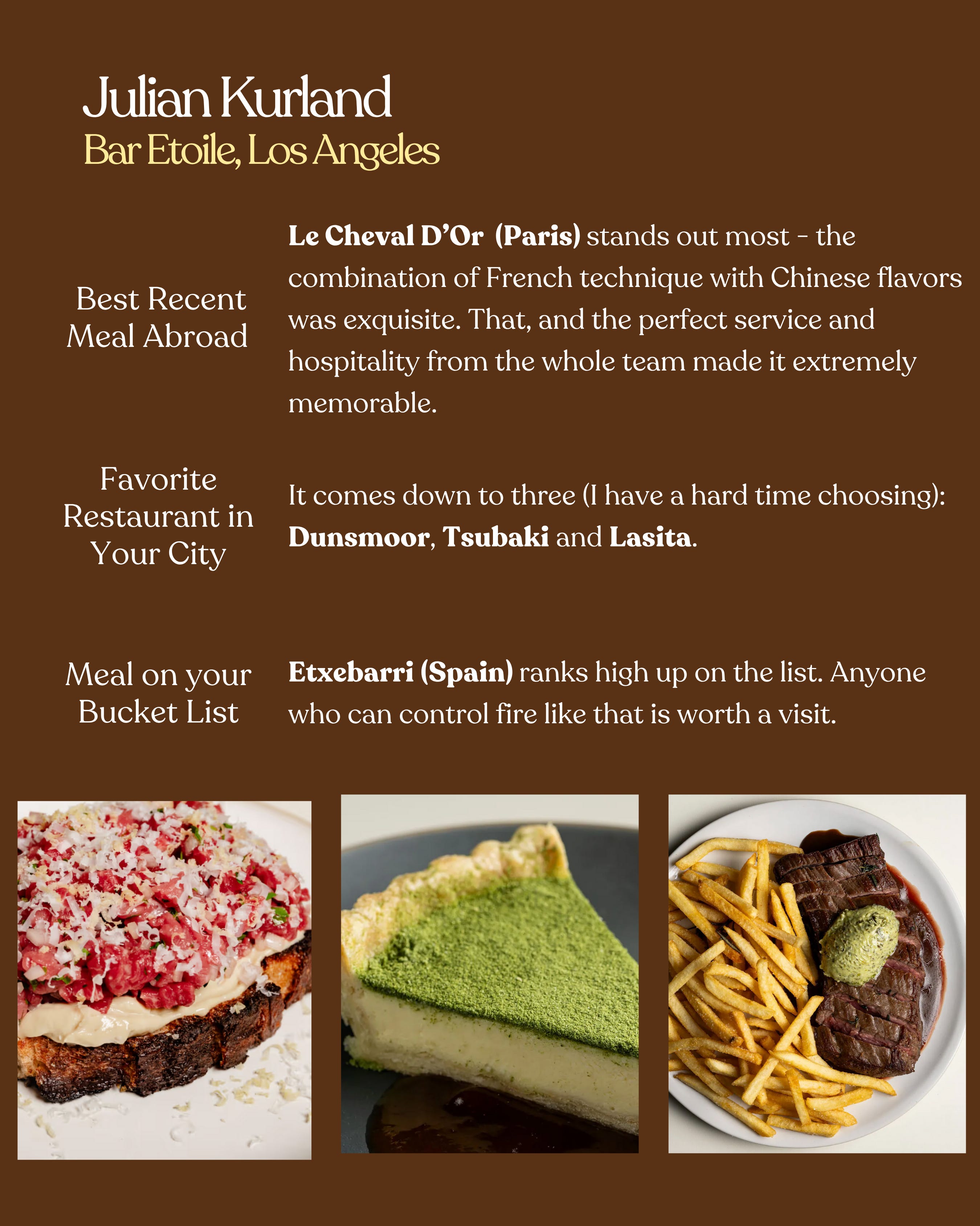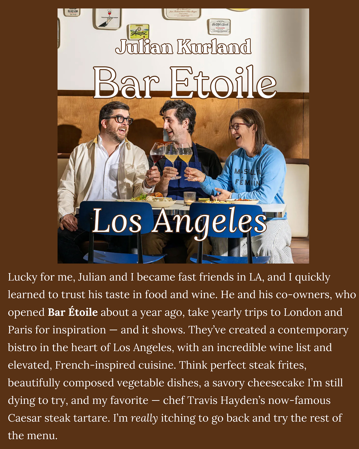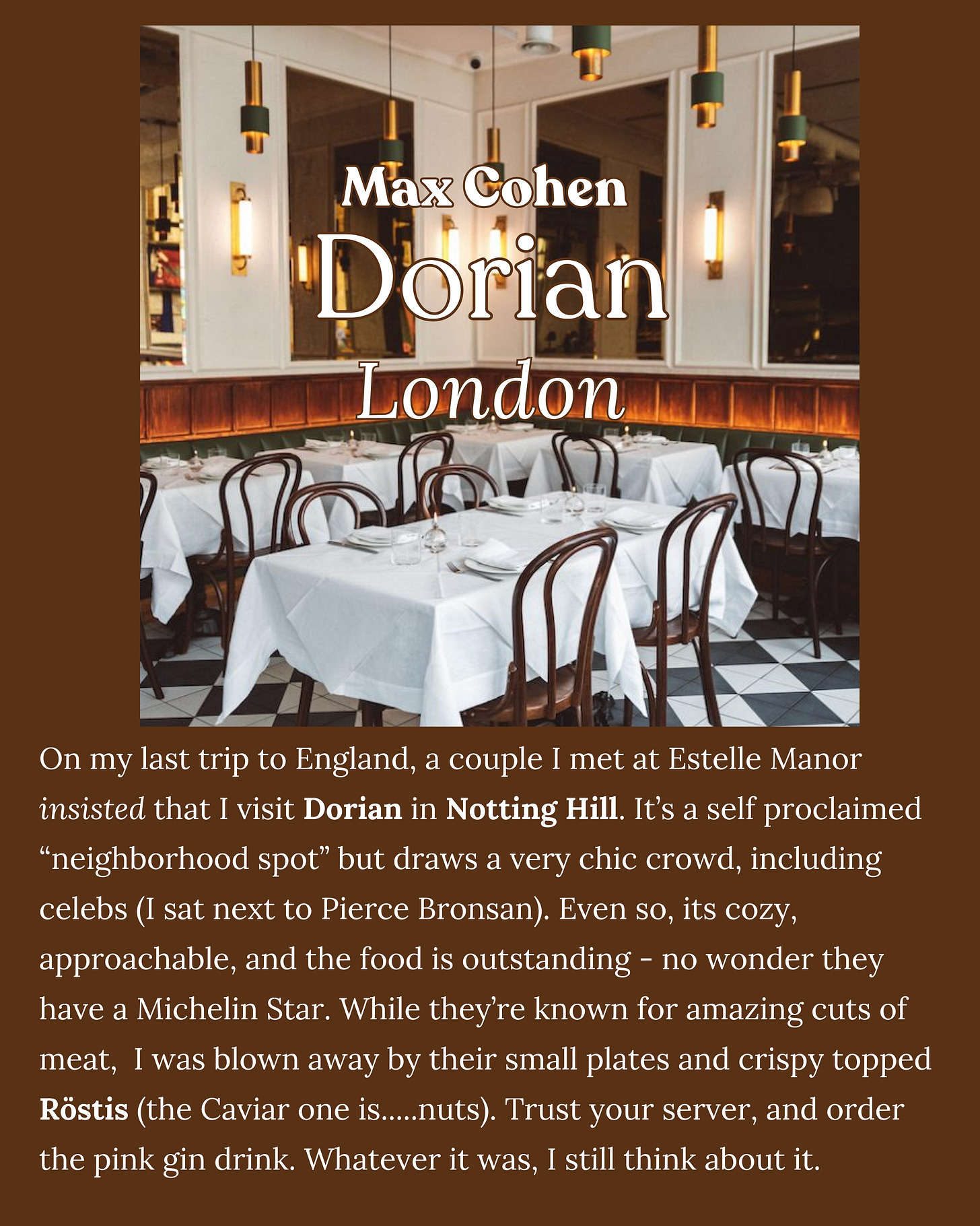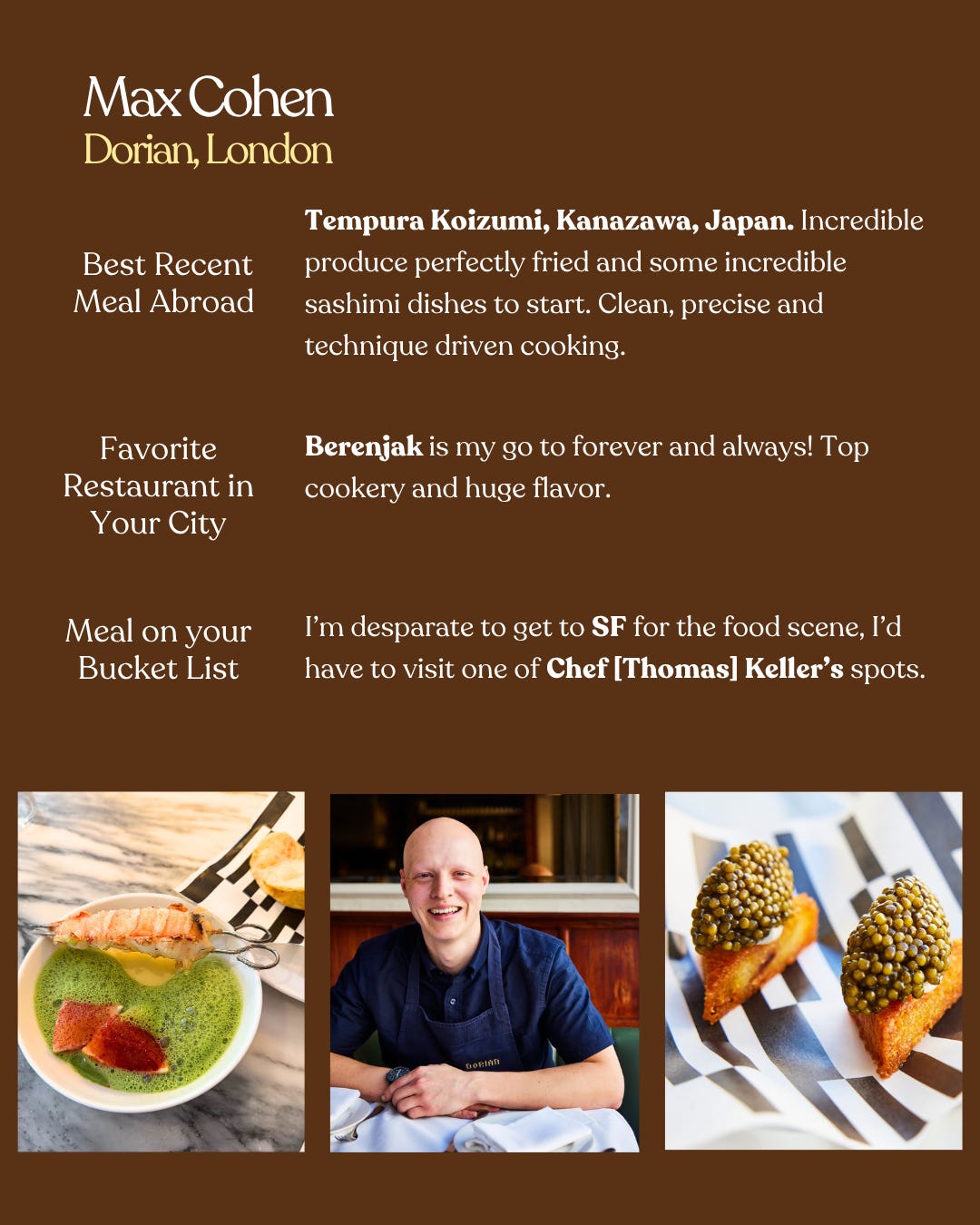 I created this column to ask my favorite chefs (and friends) - people whose taste I deeply trust - where they’ve been lately and can’t stop thinking about. I love every restaurant featured, and if I haven’t been yet - you can bet they’re on my list now.