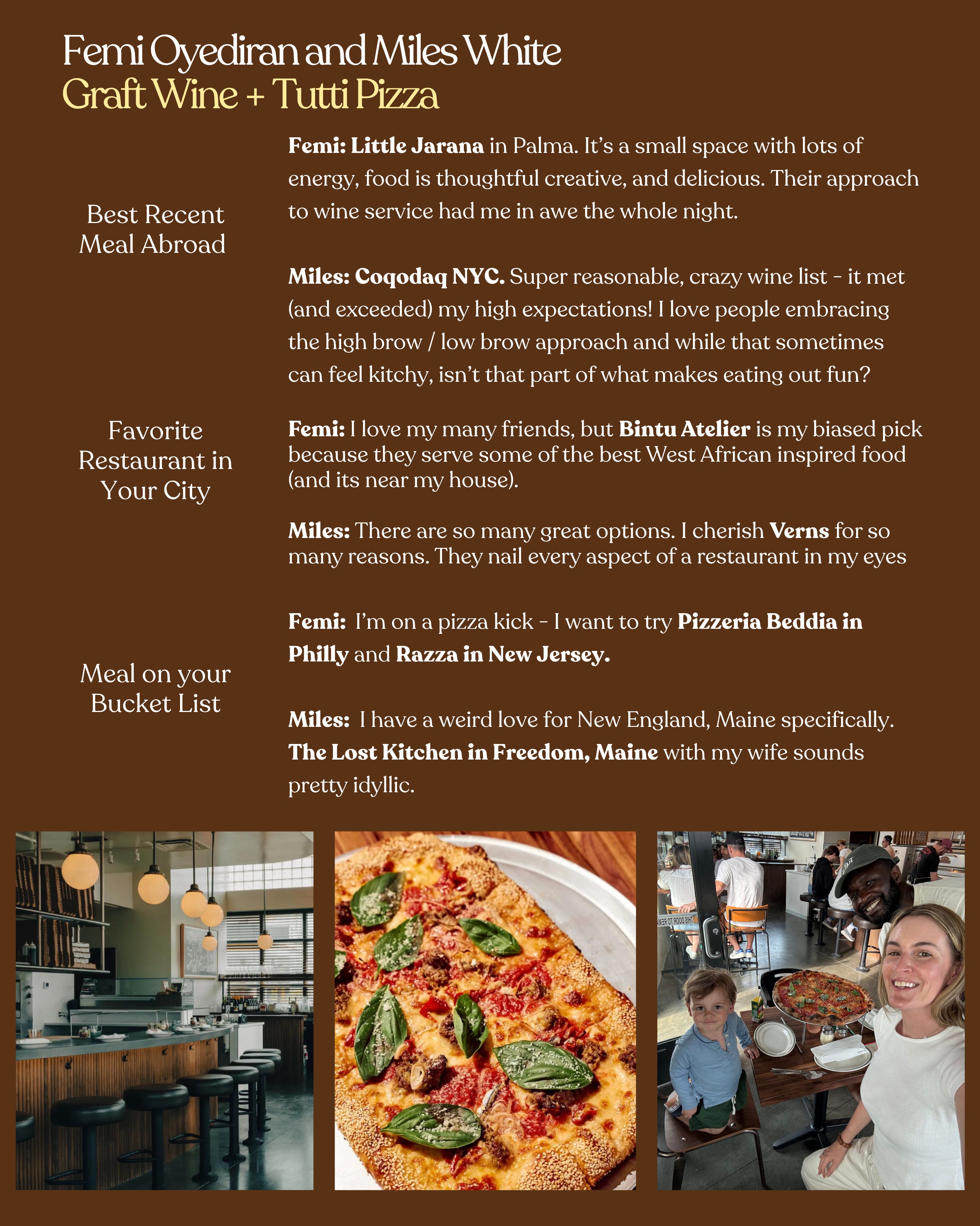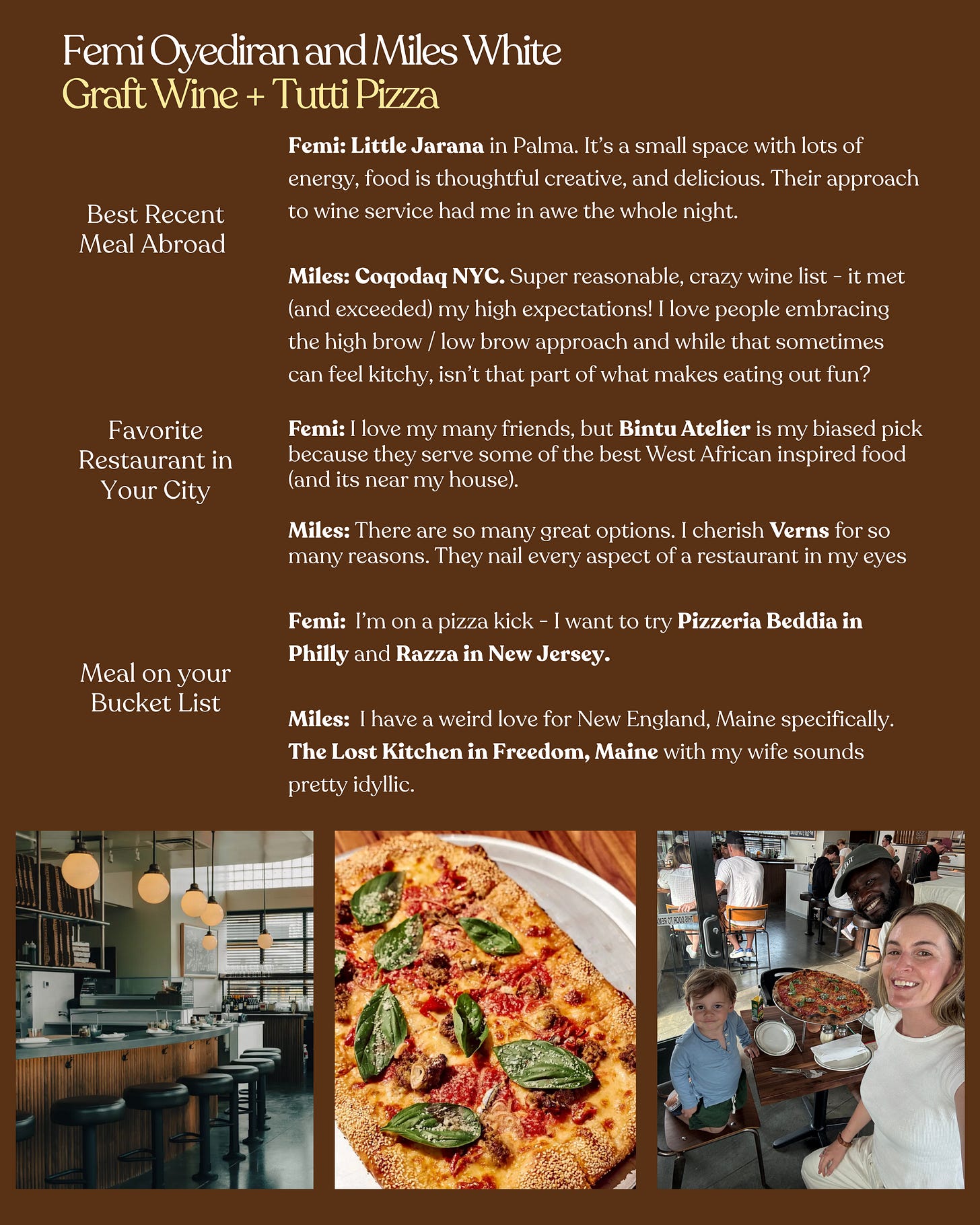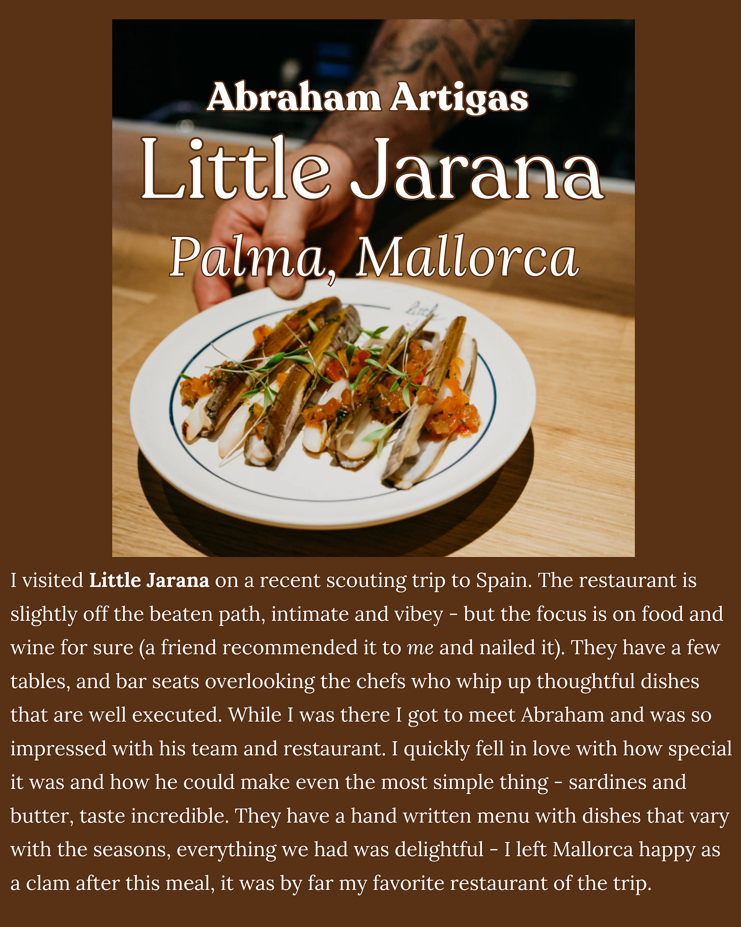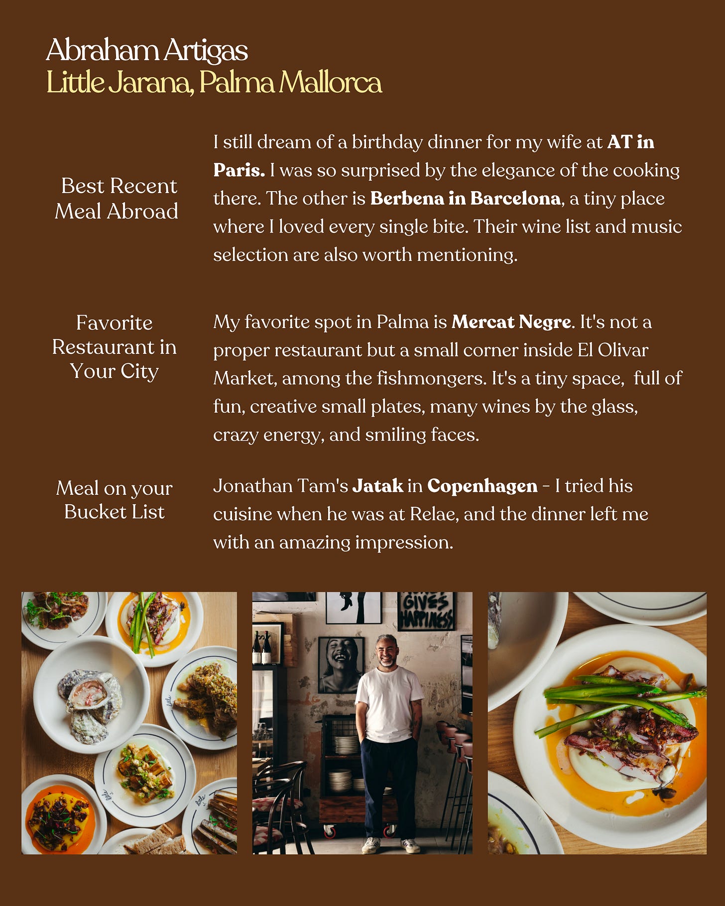I created this column to ask my favorite chefs (and friends) - people whose taste I deeply trust - where they’ve been lately and can’t stop thinking about. I love every restaurant featured, and if I haven’t been yet - you can bet they’re on my list now.